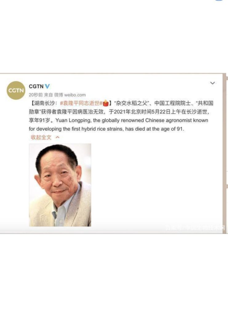 袁隆平潛心研發雜交水稻,解決了世界上的糧食難題,讓中國人民、世界人民吃飽飯,是我們追隨的榜樣。今天上午在實驗室解剖小鼠,突然師姐說好像袁老去世了,也沒往心裏去,但記住了這件事。中午打開微信、Facebook和Twitter,看到的便是一堆媒體在闢謠:袁隆平去世是假消息,以及cgtn(中國國際電視臺)被炸了的微博和Twitter。呵,官媒造開謠了,我當場震驚,也很氣憤,和幾位朋友談論了半天相關的事情。之前還有過人民日報造謠送鴨子到非洲滅蝗(年代久遠,不過應該能在他Facebook專頁上找到)、新京報對成都49中學生自殺的事情添油加醋(文章一股BBC風),甚至煽動顔色革命和仇恨。真的不明白,現在的官媒到底是怎麽了😡😡😡。幾件事情,真是對他們的公信力大打折扣。