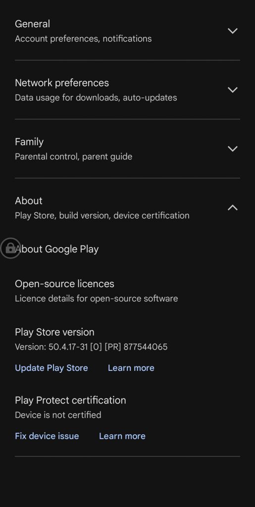 這時點擊play商店裏面的頭像(此時谷歌APP的報錯提示例如賬號驗證之類的可以點進去處理了),找到設置,在最後關於裏面找到play protect認證,點擊修復設備問題