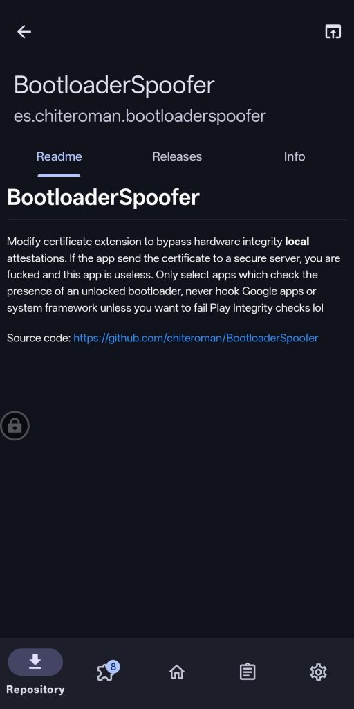 - 操作:在 LSPosed APP中搜索安裝 BootloaderSpoofer 模組。