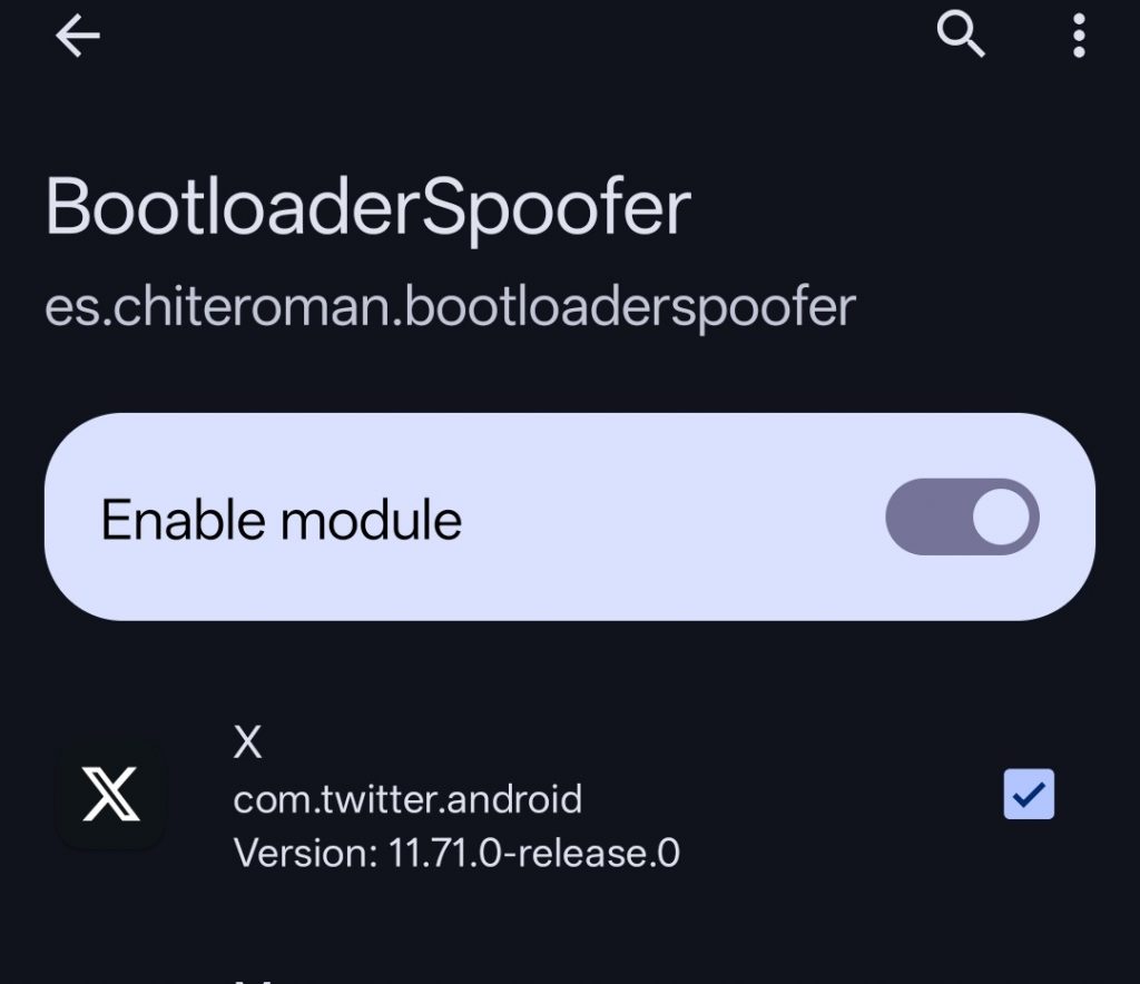 - 設定:在模組設定中勾選相應APP 如X (Twitter),這會向 App 偽造一個「已鎖定 (Locked)」的 Bootloader 狀態。