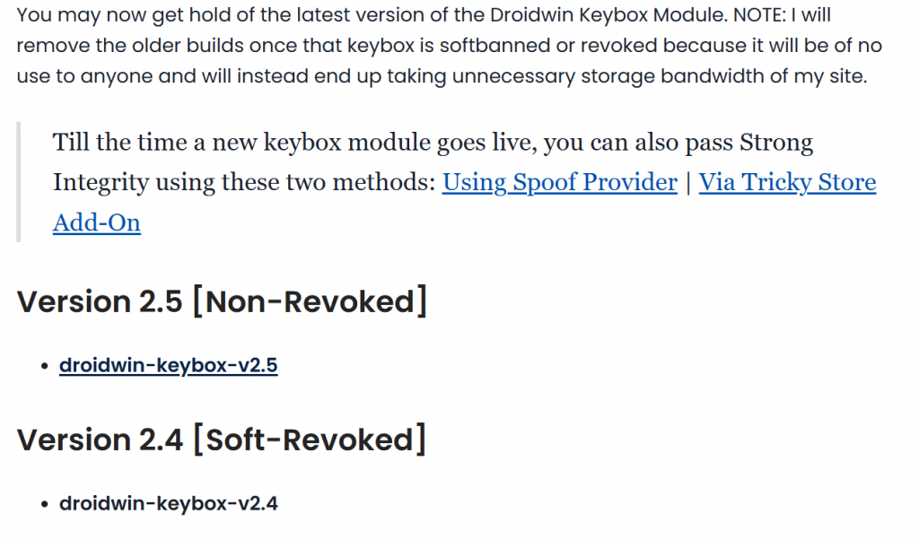 - 有效的 keybox.xml:這是核心檔案。由於 keybox 檔案極易失效(Revoked),你需要在 Telegram 頻道(如 PIFkeys)或一些 Root 技術論壇中搜尋「Latest keybox.xml」。 這裏有一個參考的keybox.xml文件來源(重點是第二個鏈接,裏面是keybox.xml文件,選擇Non-Revoked未失效的文件),也是我用的文件:https://www.youtube.com/watch?v=hl4sPtcVPCg、https://droidwin.com/droidwin-keybox-module-gives-you-a-new-unrevoked-keybox/、https://droidwin.com/how-to-pass-strong-integrity-on-unlocked-bootloader-root/、https://droidwin.com/get-your-unrevoked-keybox-xml-file-here-pass-strong-integrity/